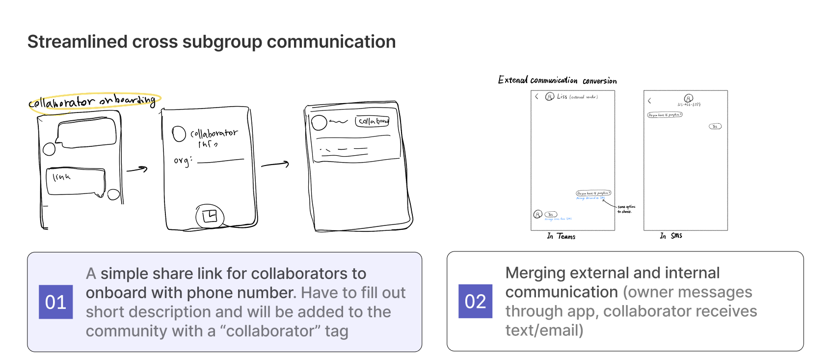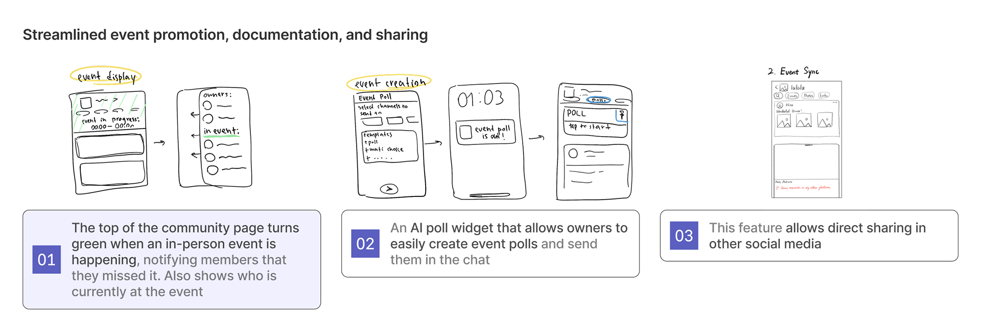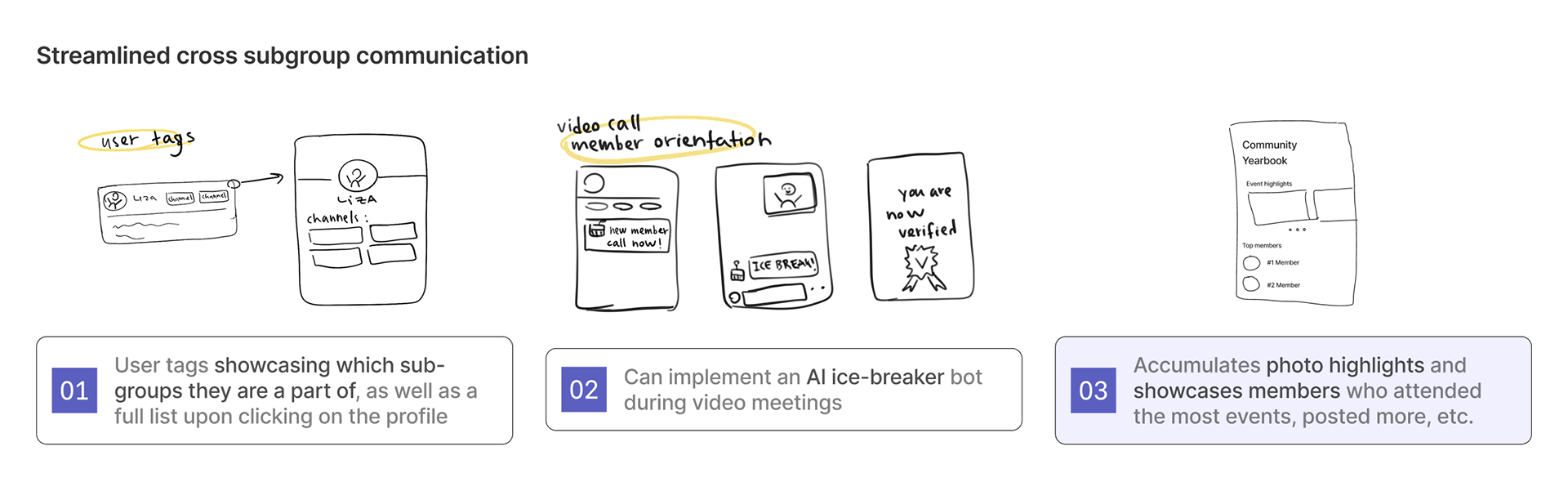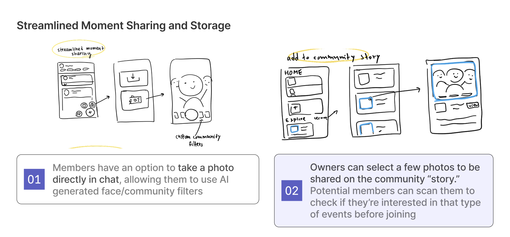 We brainstormed over 15 sketch concepts and live tested them with 4 community owners, narrowing down to ones that scored highest in quantitative impact ratings and had most potential based on qualitative feedback.