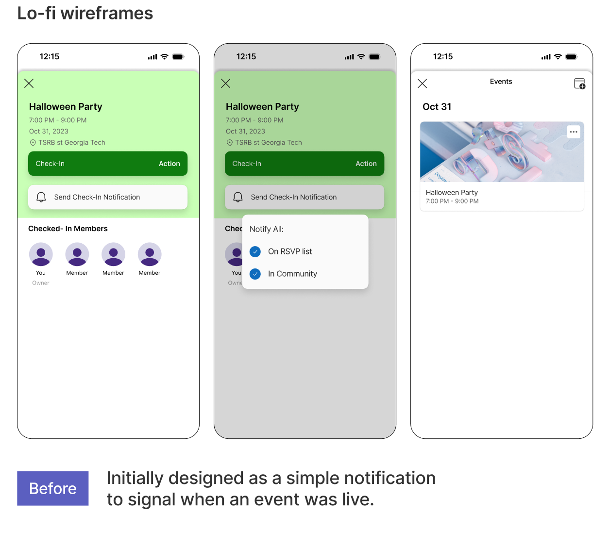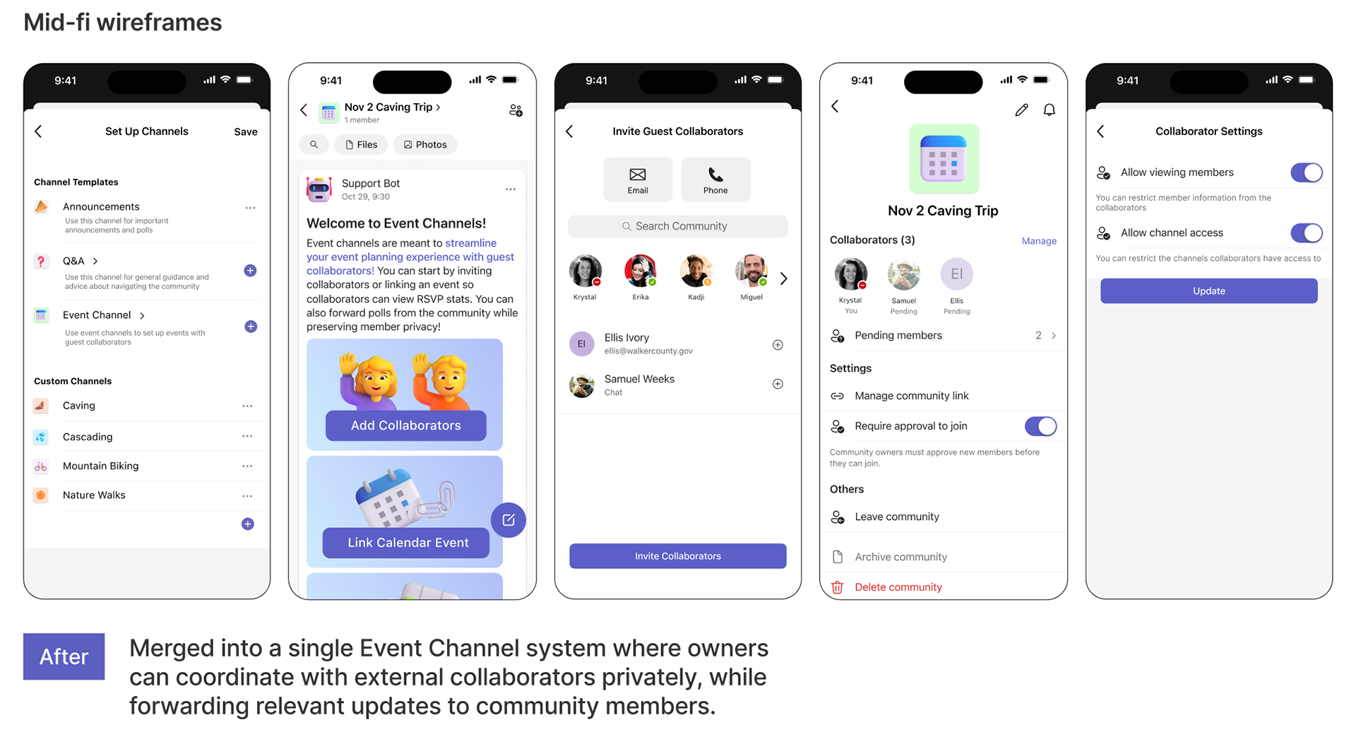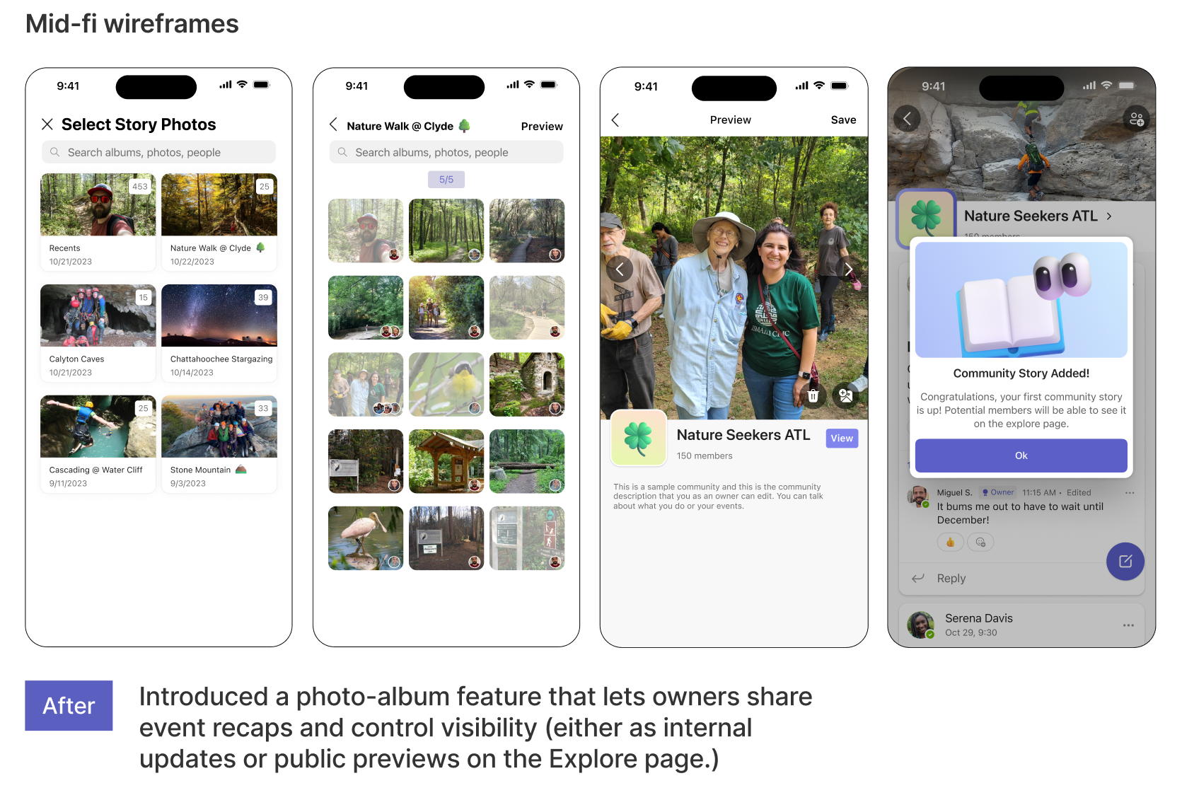 Through 2 rounds of wireframing and live testing we cut, expanded, and refined selected features. With each feature, our goal was to rework it until owners were convinced to onboard the app and use Communities as their new platform.