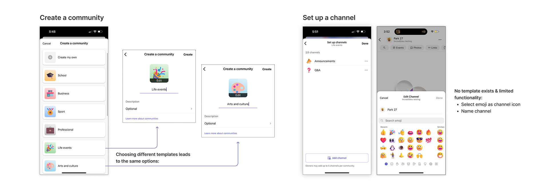 Owners appreciated the presence of templates and expected them to contain different options based on what kind of community or channel they are trying to create. On the current app, however, templates were either missing or contained the same options for different selections.