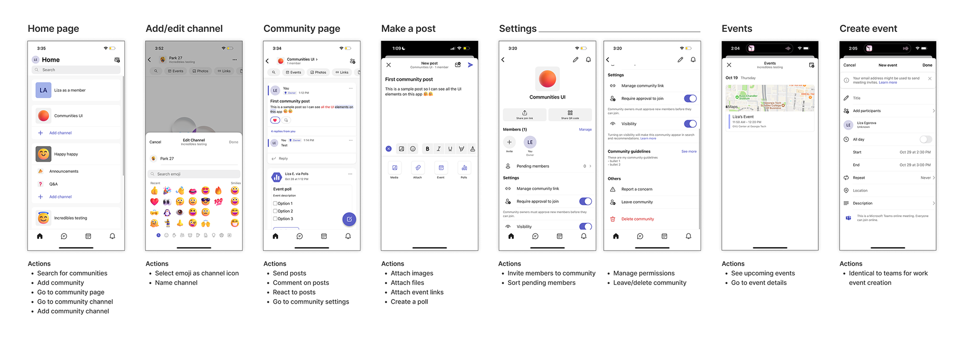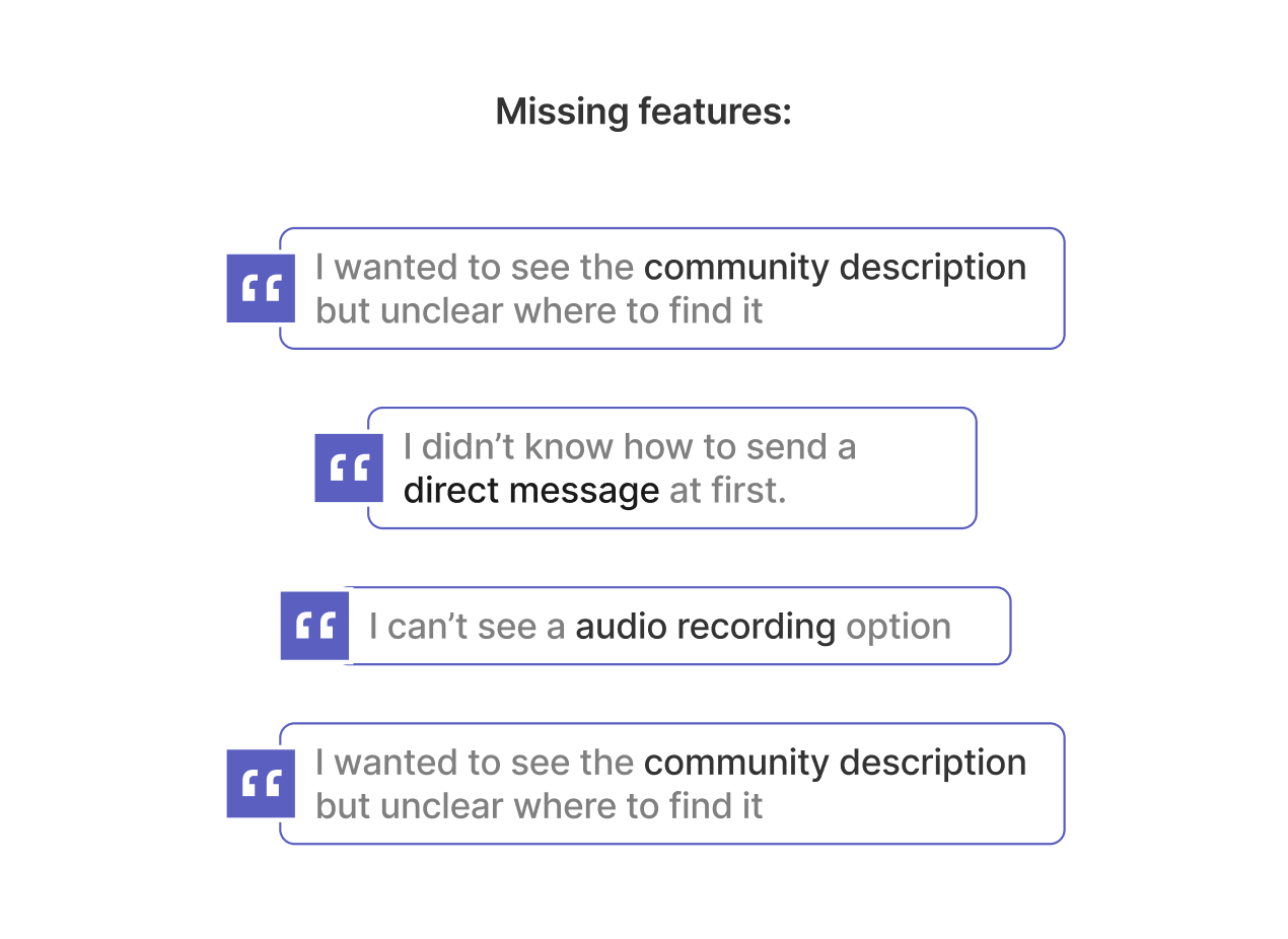 Before defining new feature opportunities, we conducted an audit of the current Teams Communities app to understand its existing capabilities and pain points. We first performed an internal walkthrough to map all current functionalities, then ran usability tests with community owners who had never used the app before to capture first impressions and friction points: