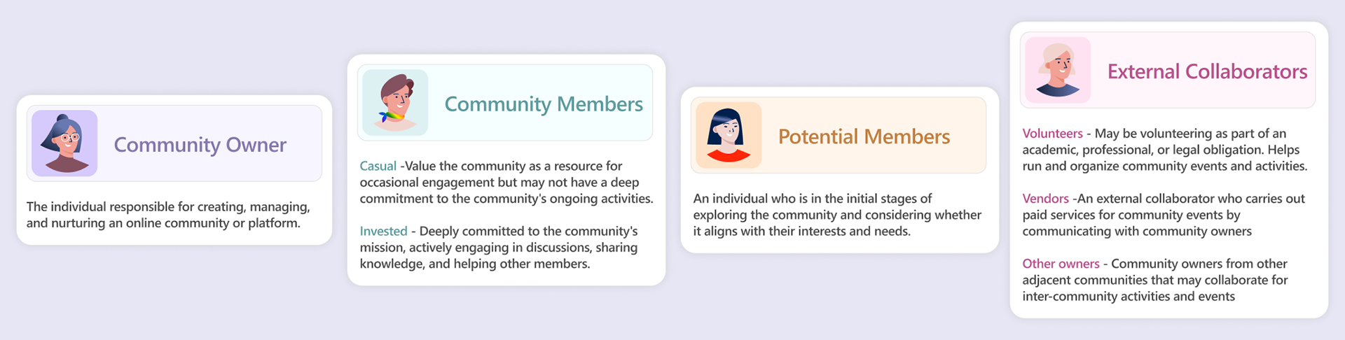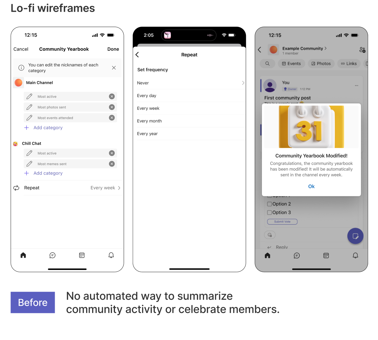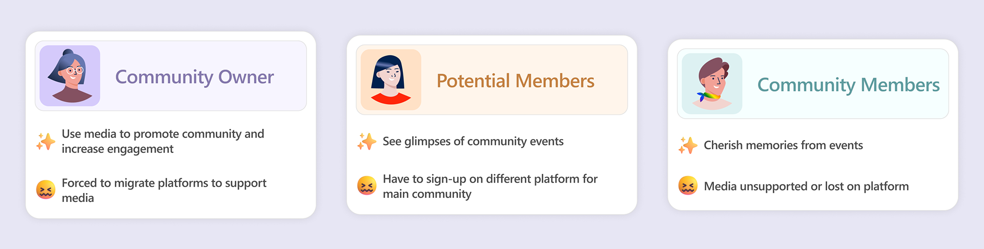 We conducted interviews with owners, community members, and moderators to understand their different roles and pain points with current platforms.